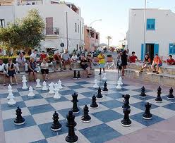San Vito Lo Capo. Piazza Marinella. Al centro una scacchiera realizzata in marmo bianco e grigio. Attorno dei grossi gradini a far da piccole tribune. Due giocatori si fronteggiano spostando pedoni, re, alfieri e regine in una partita di scacchi giganti. E’ l’ultima delle iniziative che si è realizzata a San Vito Lo Capo sponsorizzata dalla ditta Pubblicittà di Trapani. L’idea, semplice e simpatica, è quella di far gareggiare in una partita di scacchi giganti dell’altezza di 60 cm due giocatori e, nel contempo, fare di tutto ciò intrattenimento dando la possibilità a degli spettatori seduti sulle tribunette di seguire le varie fasi delle avvincenti partite. Tutti gli appassionati, al tramonto, al termine della imperdibile giornata di mare, potranno chiedere al proprietario del vicino bar Europa, in consegna gratuita, il set completo delle pedine dietro il semplice deposito, a garanzia, del proprio documento di riconoscimento. Oltre al sole, la salsedine sulla pelle e il riposo per il corpo, San Vito vuole offrire, come passatempo, anche un gioco intelligente per la mente, quale quello degli scacchi. Il risultato della piccola iniziativa è la dimostrazione di come, in fondo, sia facile coinvolgere in un’azione comune il pubblico e il privato e, nel contempo, come sia semplice, alla fine, raggiungere l’obiettivo finale di rendere attore protagonista lo stesso turista che diventa intrattenitore.