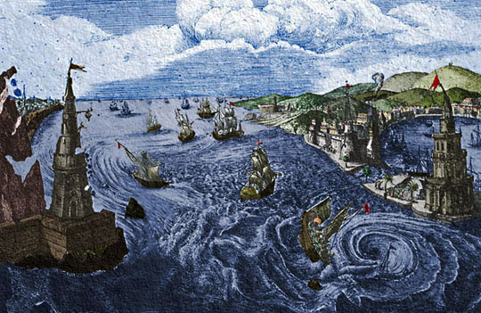 La navigazione dello Stretto, infatti, ebbe nell’antichità una bruttissima fama e realmente presenta notevoli difficoltà, specialmente per le correnti rapide ed irregolari. Anche i venti vi spirano violenti e talora in conflitto tra loro. A volte, le correnti raggiungono una velocità di 9 Km. all’ora e scontrandosi danno luogo a enormi vortici che sicuramente terrorizzavano i naviganti.