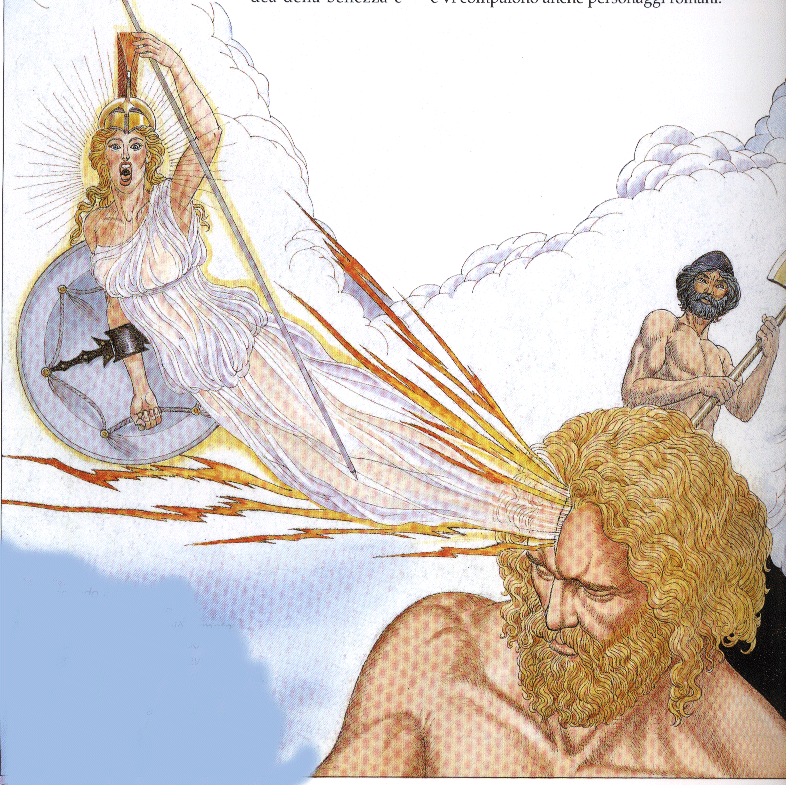A questo punto venne al dio un fortissimo mal di testa e grazie all’aiuto di Efesto o Prometeo si riuscì a spaccare con un’ascia il cranio immortale di Zeus e dalla ferita uscì Atena.
