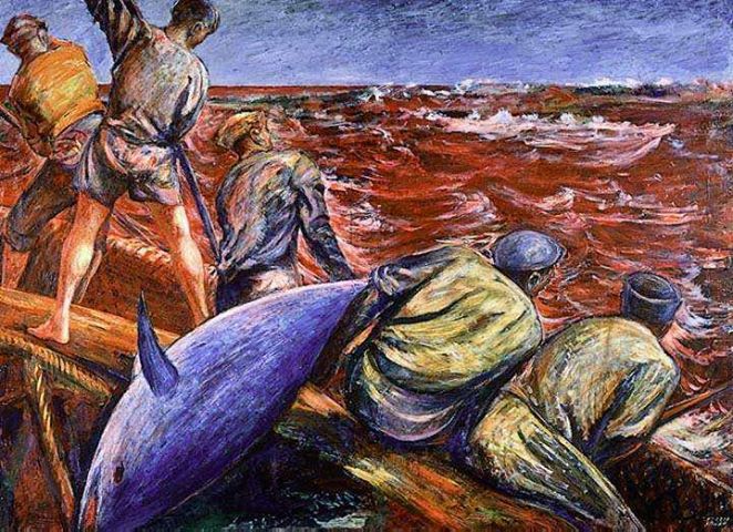 Infine, la fase finale della pesca, la mattanza, avviene oggi come ieri ed ha sempre lo stesso fascino crudele seppure liberatorio. Il mare è completamente rosso per la gran quantità del sangue. I marinai dalle due grandi barche si curvano, e tutti, armati di uncini, attendono che le vittime siano a tiro . Quattro uncini penetrano nella carne dell’animale, lo tirano fin sotto il bordo.